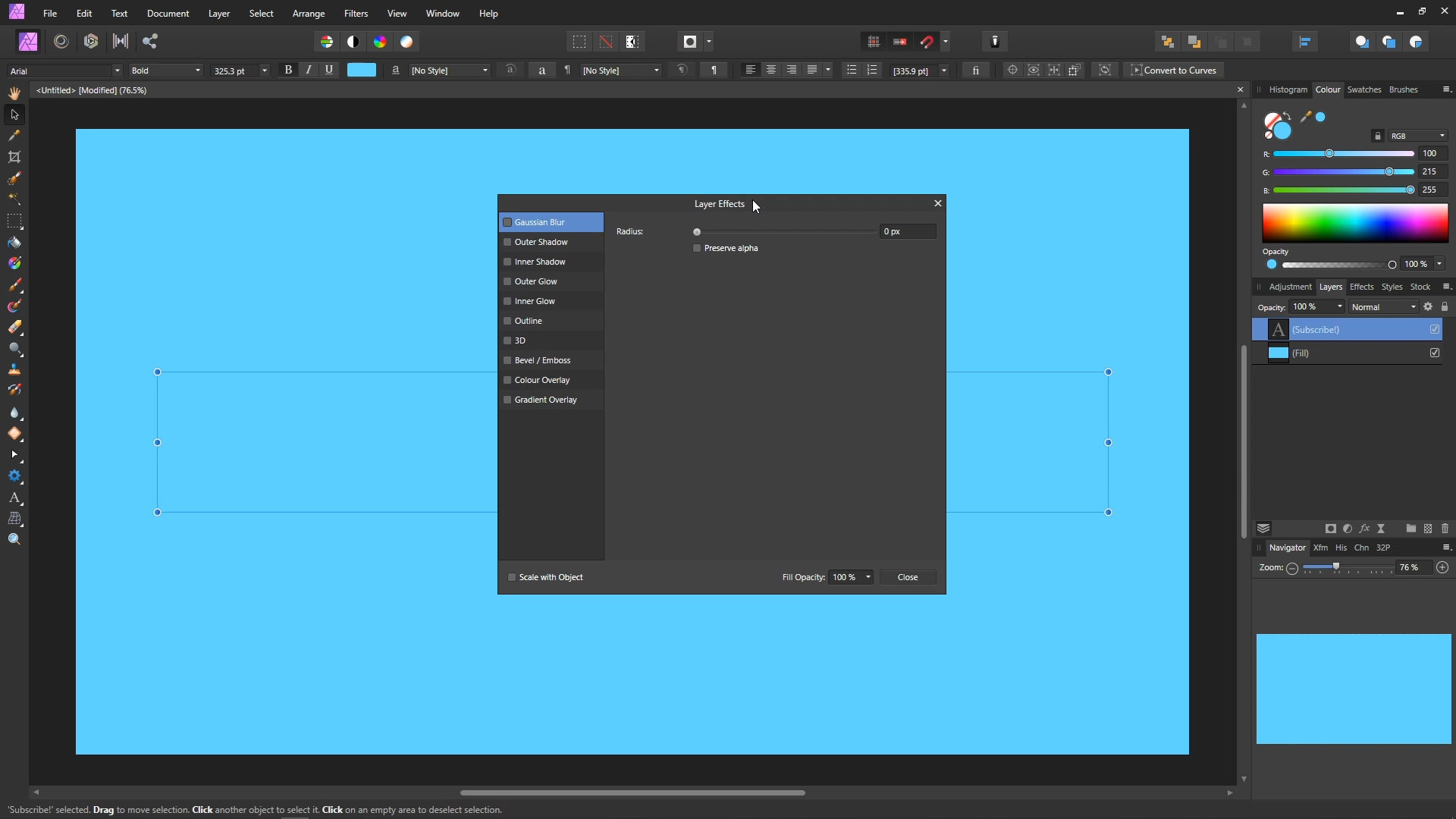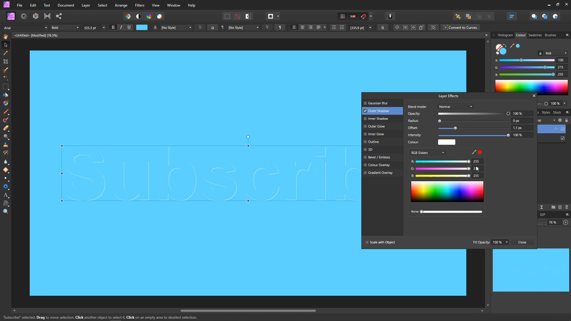 In the Colour tab on the right, make sure RGB is selected on the drop down menu, and set the colour to 100, 215, 255. This will give you a nice cyan colour which looks really nice for this effect.