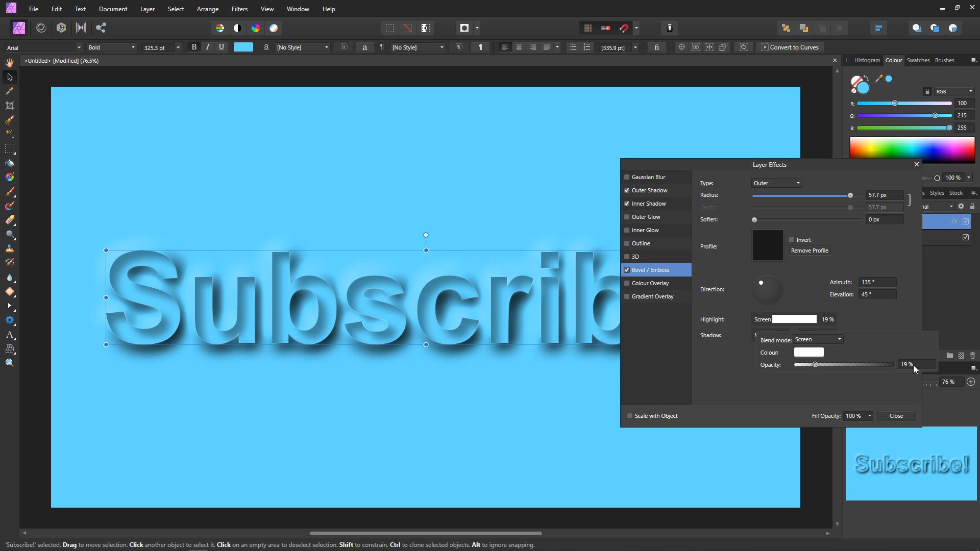 We're now going to use the Highlights and Shadows on this panel to soften the effect. Click on the Highlights colour box, and on the little dialog set the Opacity to 19%. Then click just outside the little dialog to get rid of it.