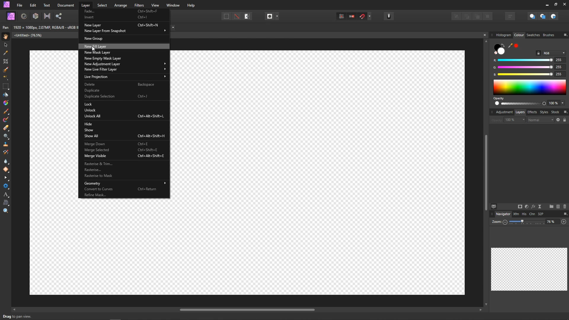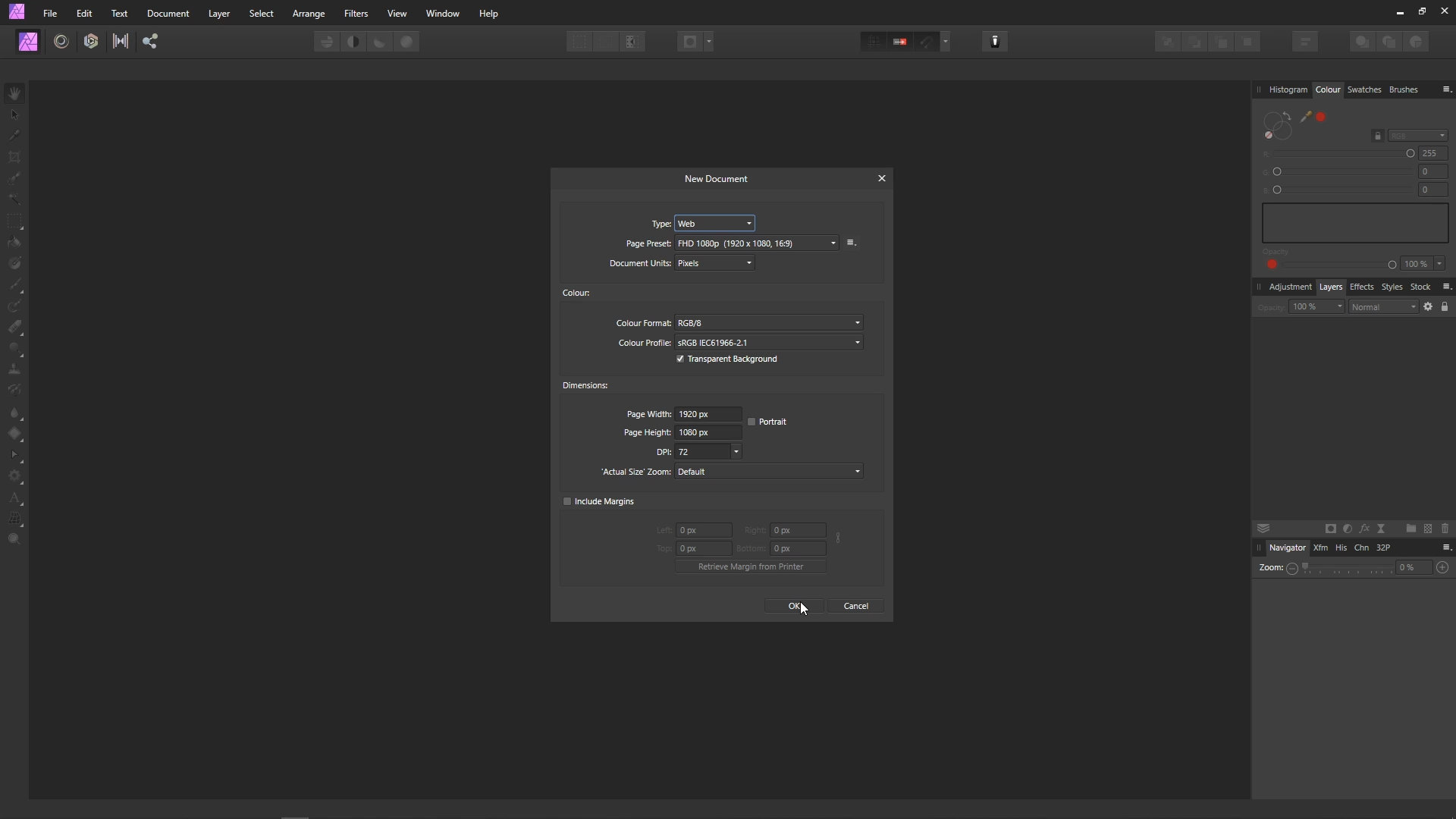 Create a new image, set the resolution to 1920x1080, and click OK. The resolution is important for this tutorial, as the parameters we will be typing into the layout effects panel are resolution dependent.