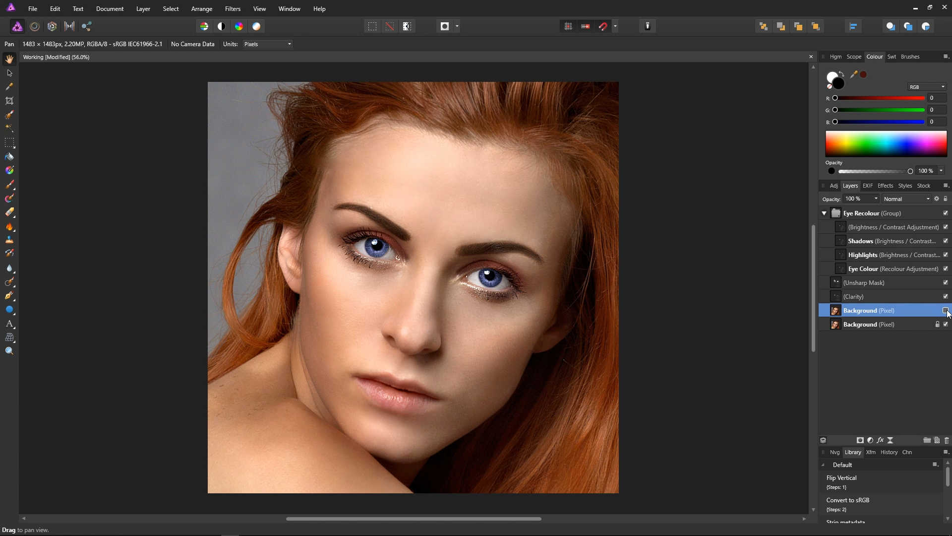 That concludes this tutorial, we have recoloured the eyes, added some clarity, performed some sharpening around the eyelashes/eyebrows, and made the pupils larger.