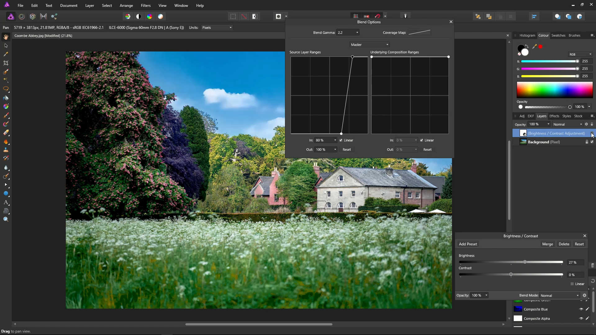 At the moment this will affect the entire photo, and we only want to target the shadows. So let's bring up the blend ranges dialog.