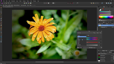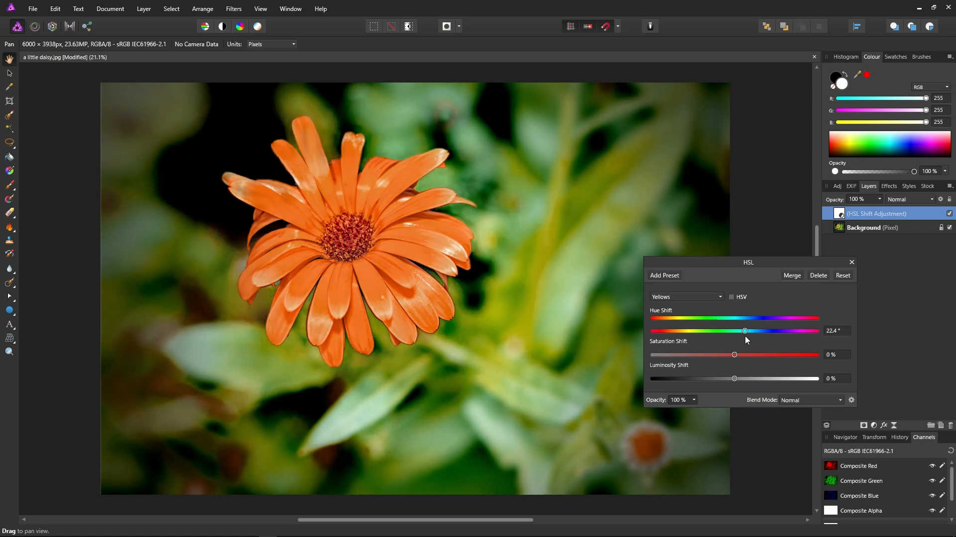 Using the slider, set the hue to change the colour. In the example photo, we've made the petals a dark orange by setting the Hue to 22.4.