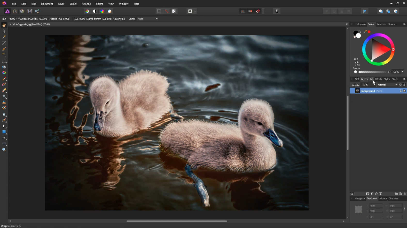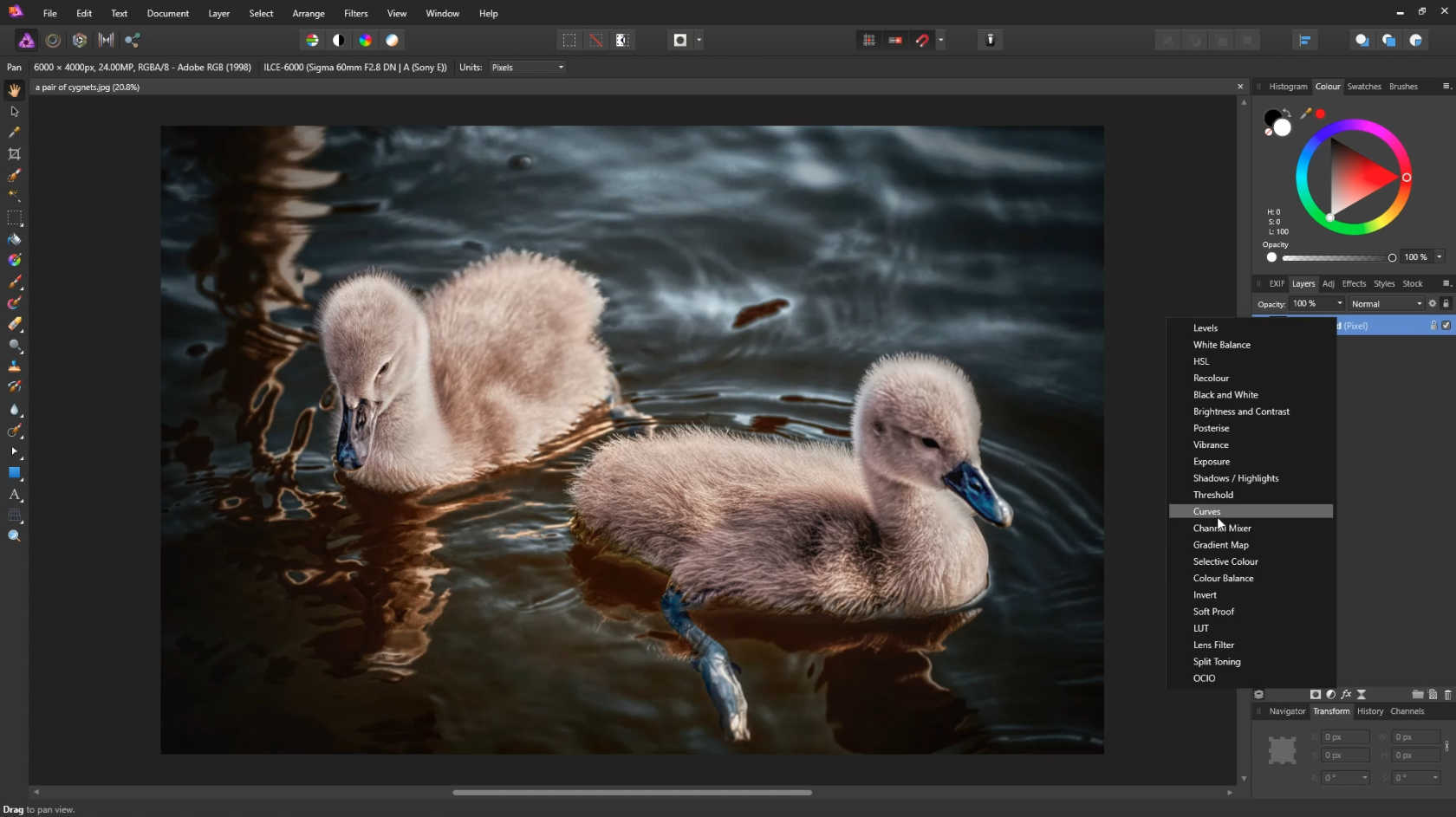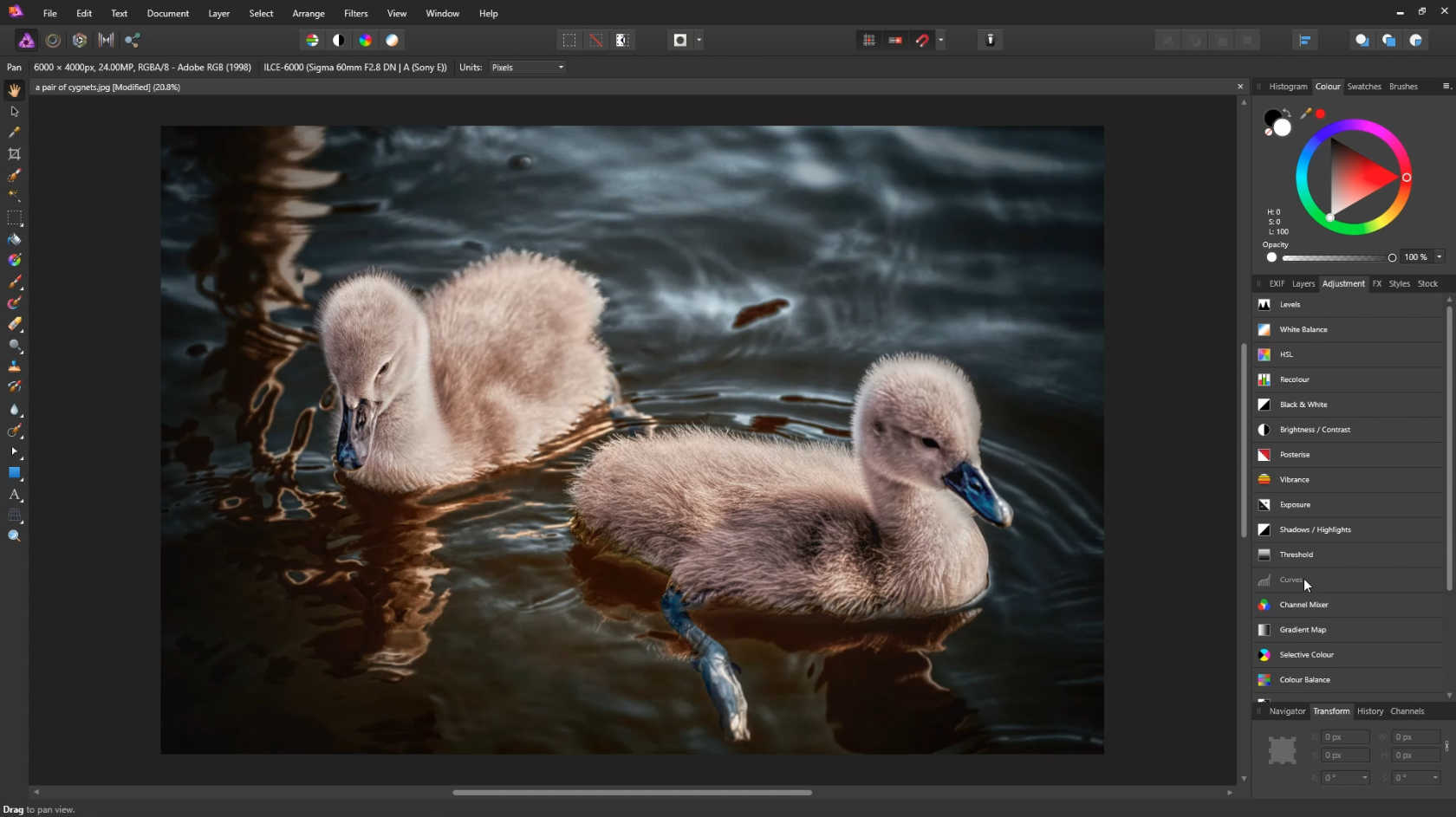 Open an image in Affinity Photo, then select the adjustments icon.
